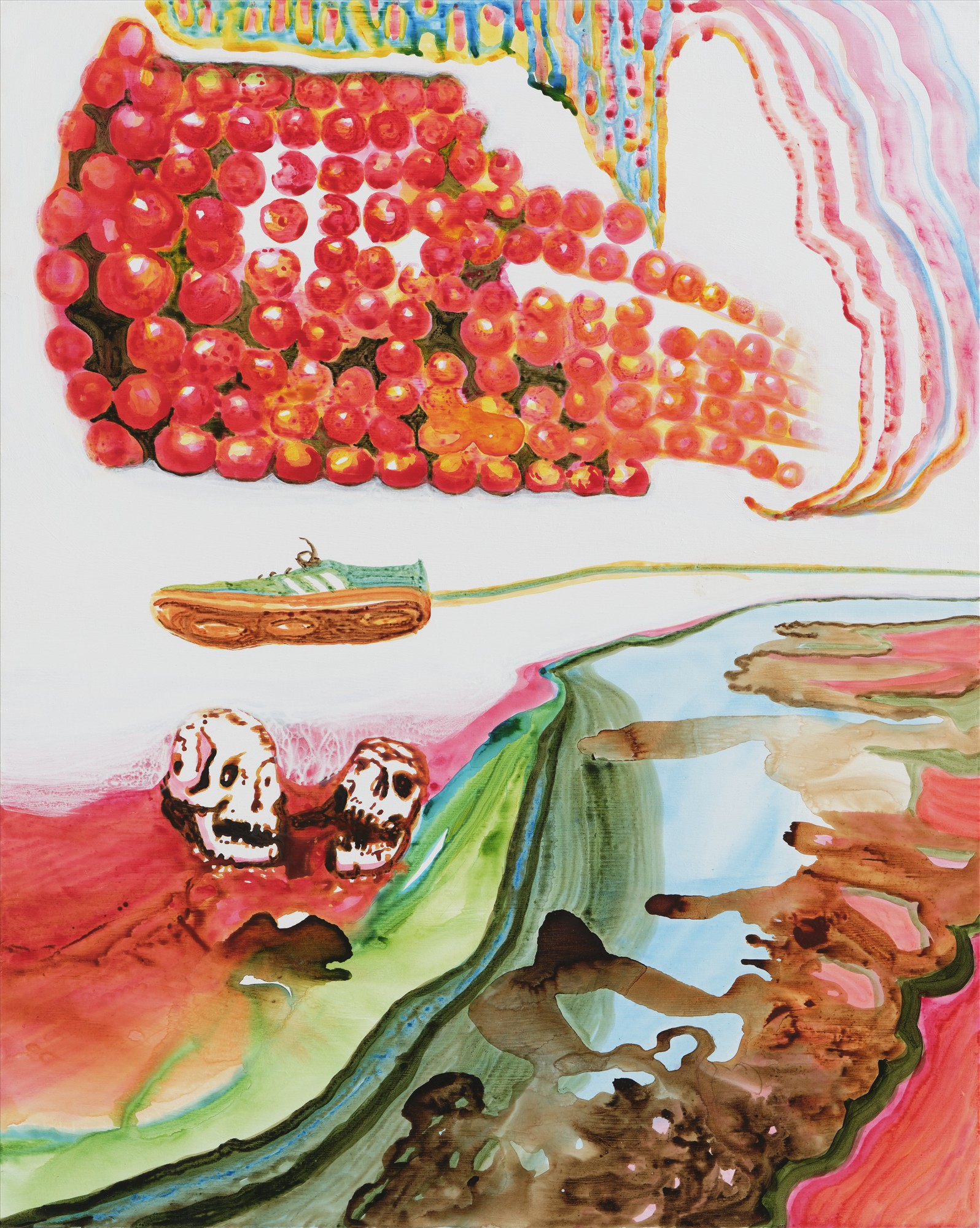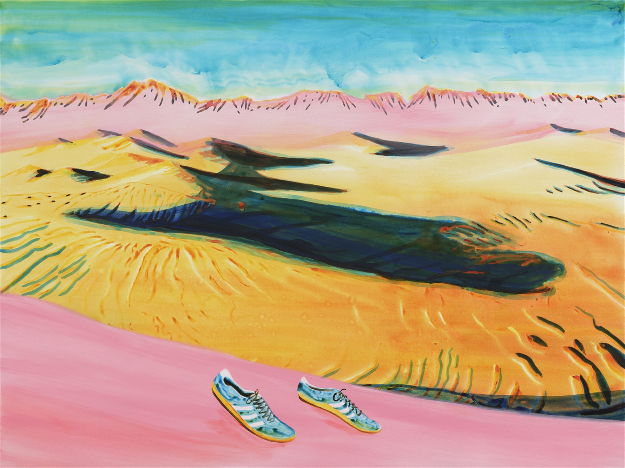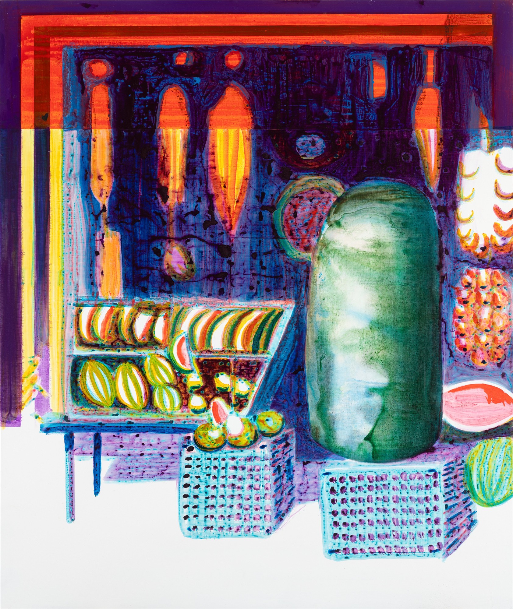John Kørner’s work poses questions that expand the visibility of societal concerns. Contemporary global issues such as migration, sex trafficking, conflicts, and systems of production and consumption are termed as ‘Problems’ that form an ongoing inquiry within his work. His vibrant and visually saturated paintings and prints (often featuring handmade painted frames), site-specific murals, sculptures and installations, belie a fascination with the aesthetics of colour and format, whilst paradoxically appearing alongside difficult political and social dimensionalities. Despite confronting the many challenges of the 21st century, his narratives remain somewhat ambiguous, allowing for the entry of curiosity, open interpretation and the visual experience of the work. Figures are oddly accompanied by floating ‘thought bubbles’, pondering problems, as they roam vast landscapes, supermarkets, and beaches, or enter doorways, climb stairs and ride elevators.