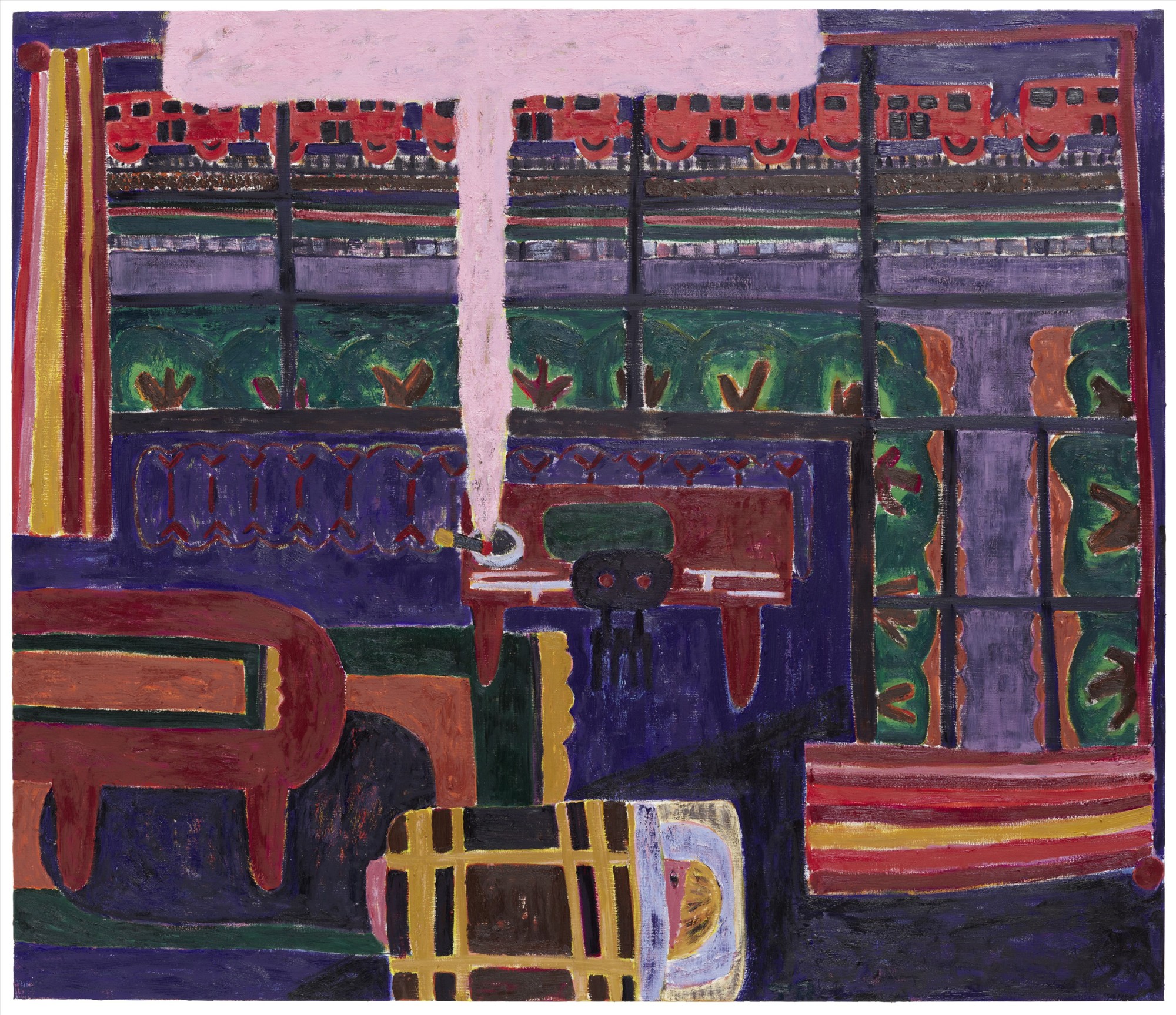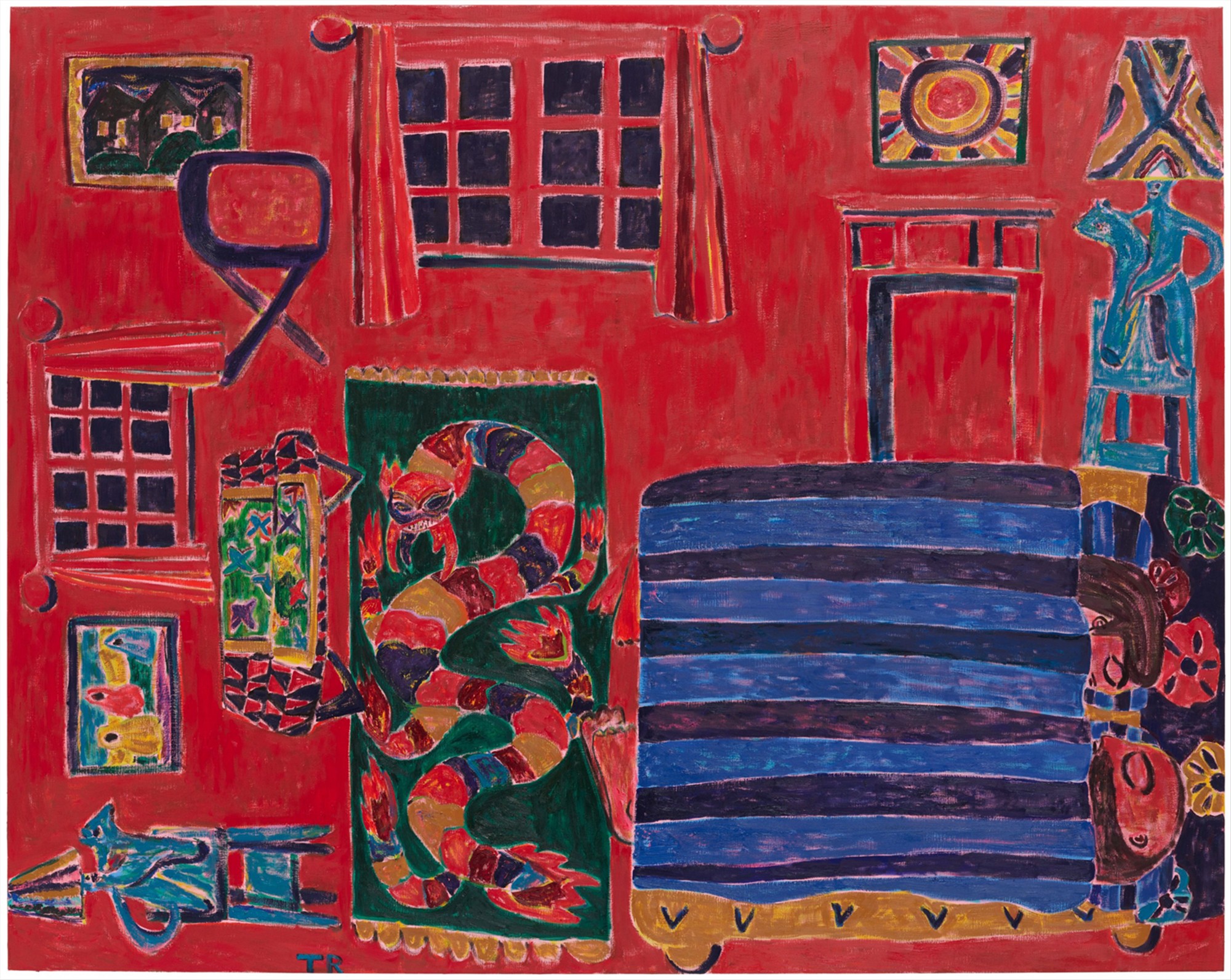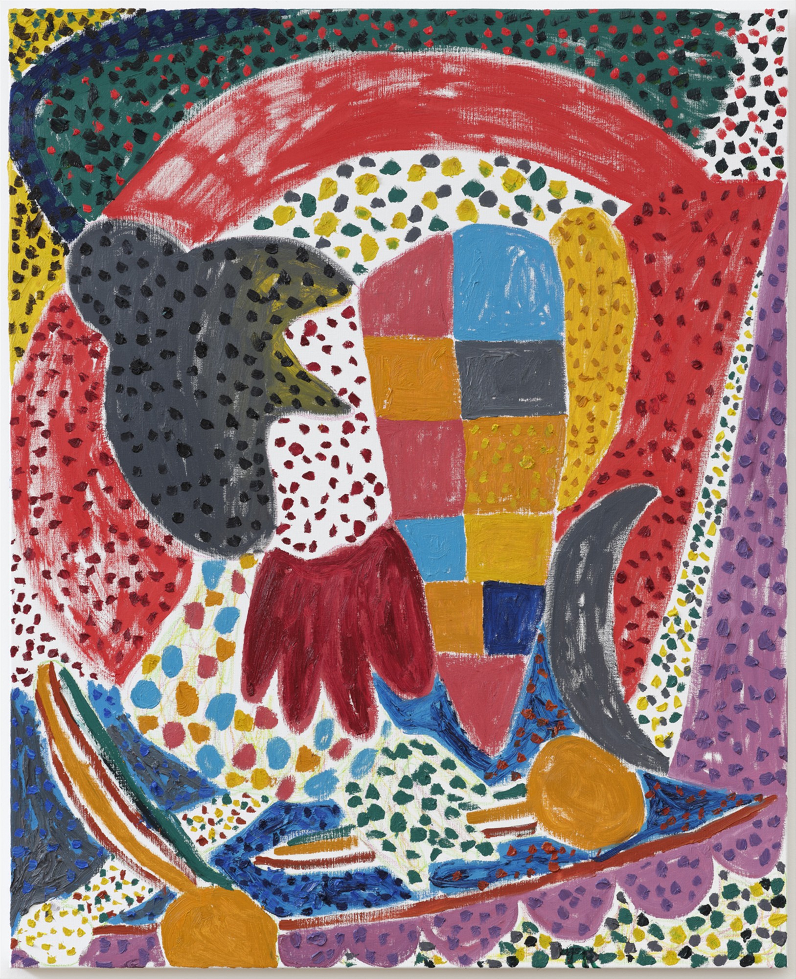 Tal R’s expressionistic work is immersed in a visual language that considers the figurative and its inherent mystery as a salient motif within his sensual and intuitive images. His practice broadly includes painting, drawing, collage, prints, sculpture and installation. The luminous quality of the paintings is expressed through the application of lusciously applied oil paint. Foregoing prefabricated black colour, he combines colours to create a bespoke ‘black’ within his palette, further eliciting ‘the feeling of colours colliding with other colours’. The naiveté of outsider art and the experience of the everyday has formed his approach drawn from past and present––ranging from nostalgia for the streets, bars, and sex shops of Copenhagen to the intimacy of the boudoir, where nude figures recline, and to the home, where accumulated bric-à-brac resides.