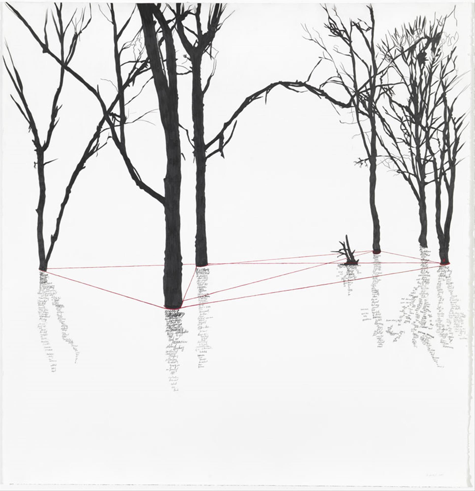 Døde ravne som falder ned i sneen foran en hytte; blodet fra de døde ravne er ved nærmere øjekast digte. Fugle som flyver i flok med citater efter dem. Hver sætning er et spor, der eksisterer to gange, en gang synlig og en gang næsten usynlig. Det, der umiddelbart fremstår som fugleflokke i det slørede landskab, er citater, hvor ordet Bird nævnes om og om igen. Således undersøger begge kunstnere spørgsmålet om opløsende grænser og abstraktion, der kan befri sted og landskab fra sit billede.