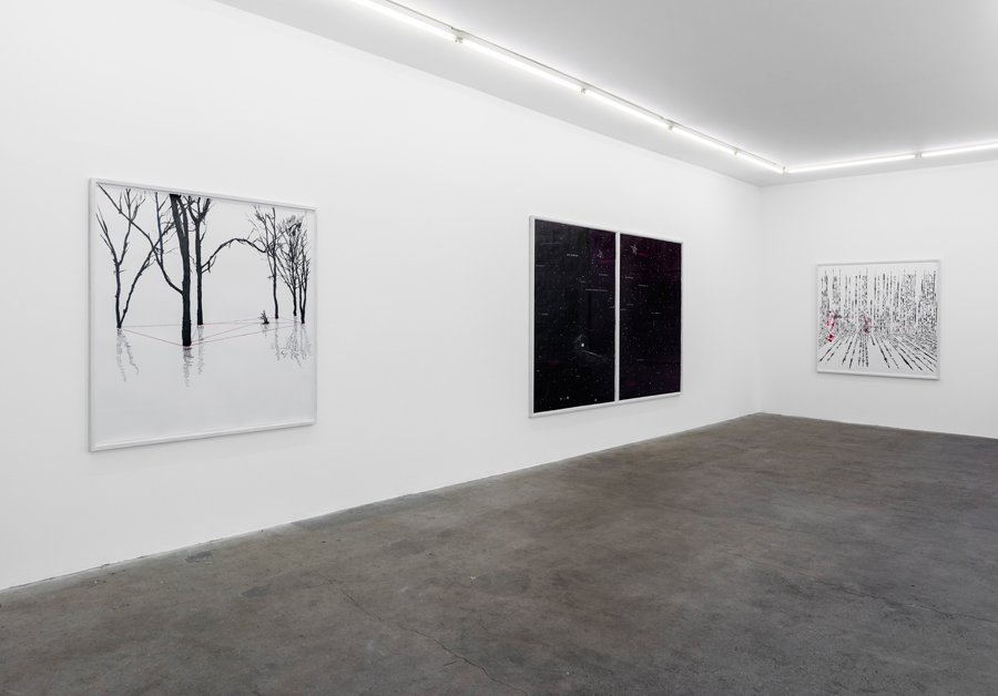 Brigitte Waldach is exhibiting her own works in the first exhibition room in the gallery’s west-facing wing. Waldach’s large-format drawings focus on outer space, landscapes and the layering of space. The text binds the levels together ¬– as figure, picture and model, and embedded with deep meaning.